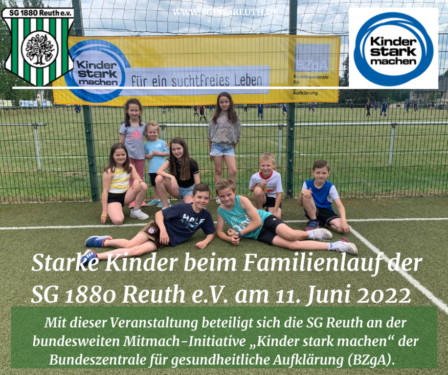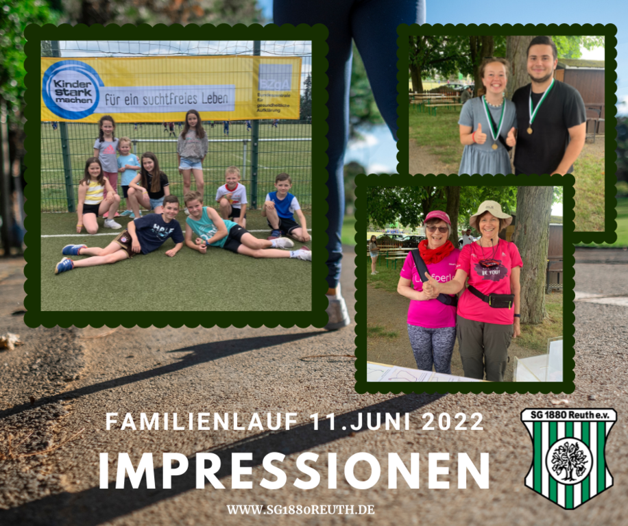 Unter dem Motto „Komm raus mit dem A* an die Frühlingsluft" riefen die Initiatoren der SG 1880 Reuth e.V. auf vier Strecken unterschiedlicher Längen zum gemeinsamen Laufen, Walken oder Spazierengehen auf. Bei bestem Frühsommerwetter beteiligten sich von 15:00 - 17:30 Uhr 70 kleine und große Sportler/innen. Es wurden über 410 km erreicht. Eine besondere Ehrung erhielten 30 Teilnehmer, die alle vier Strecken absolvierten.